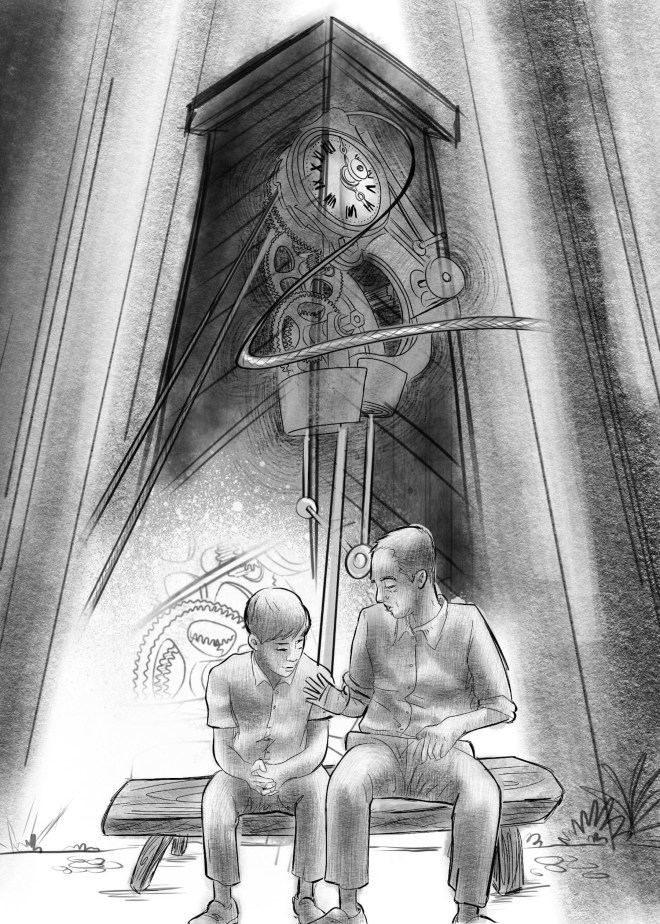 Las autoridades oían los campanazos y decían: ¡Ahí está el preso! Pero a la mañana siguiente la campana dejo de sonar… entonces dijeron ¡Quizá el hombre se murió! y corrieron a abrir la cárcel… ahí lo único que encontraron fue el enredijo metálico, la campana y la hediondez… ¡Se había inventado el primer reloj!” me dijo mi papá … y yo como estaba chiquito creí que el reloj que estaba allí en la torre y que yo había visto antes era el mismo. Así es como terminó mi fregadera ¡Qué gran mentirota la que me conto mi papá! pero yo me quede contento.
